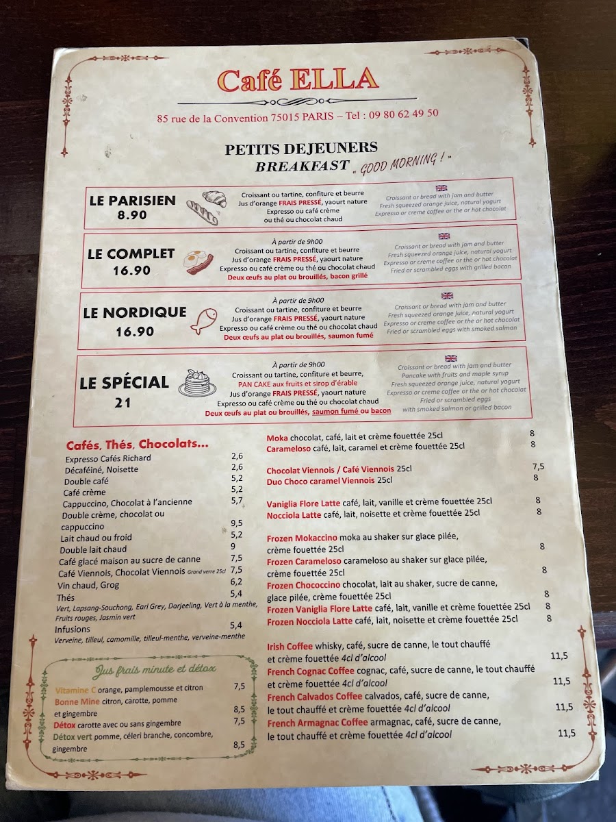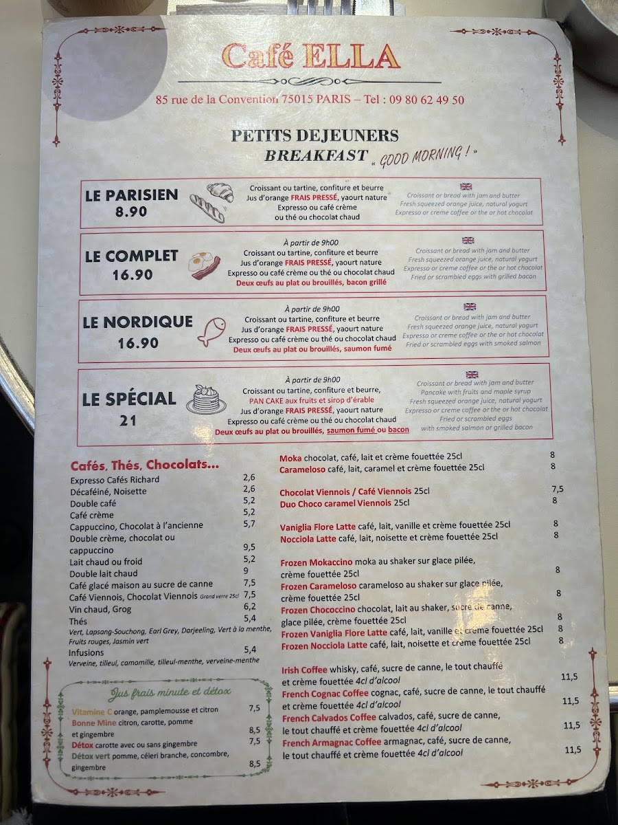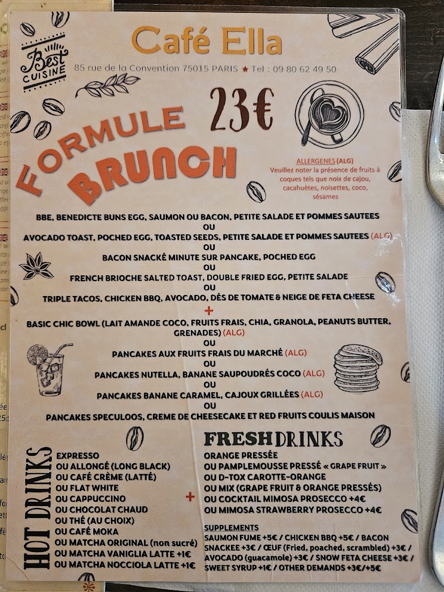 Welcome to Café Ella, a delightful culinary gem nestled in the heart of Paris at 85 Rue de la Convention, 75015. This charming café isn't just a place to grab a bite; it's a harmonious experience where the rich traditions of French cuisine blend beautifully with a cozy, inviting ambiance.